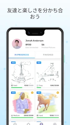 「点つなぎ: 数字でつなぐリラックスパズル」には、150点の簡単なものから2,500点を超える複雑なものまで、難易度豊かな500種類以上の無料パズルが収録されています。可愛らしい動物たち、神秘的なユニコーン、美しい花々、そしてクリスマスなどの季節のテーマまで、子供から大人まで誰もが夢中になれる多様なジャンルを探求できます。一度お気に入りの絵を読み込めば、Wi-Fi環境がない場所でも、いつでもどこでもこの素晴らしいパズルを楽しむことが可能です。完成したアート作品は、大切な人たちと簡単に共有し、喜びを分かち合うこともできます。