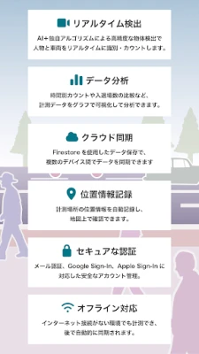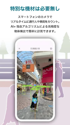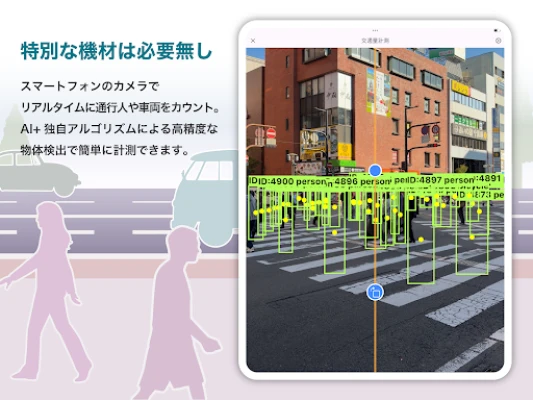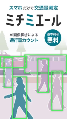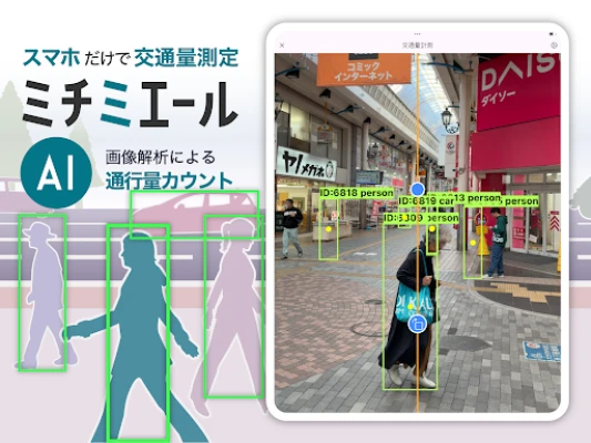 ミチミエール AI交通量調査は、スマホカメラで通行人や車両を自動カウントするAIアプリです。最新のYOLO11 AI技術により、高精度なリアルタイム検出を実現。特別な機材は不要で、道路の交通量調査、イベント来場者数把握、施設入退場計測などにスマホ1台で手軽に活用できます。