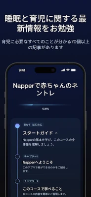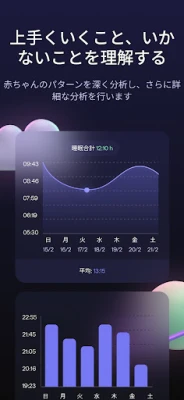 赤ちゃんの健やかな睡眠習慣を育むため、Napperには科学的根拠に基づいた豊富なガイドも充実。睡眠の基本から、ぐずる赤ちゃんをなだめるコツまで、幅広い情報を提供します。また、平均睡眠時間や夜間の覚醒回数、授乳間隔など、お子様の睡眠パターンや傾向を見やすいグラフで可視化。これにより、保護者の方々は赤ちゃんの成長に合わせた柔軟な対応が可能になり、より深い理解へと繋がります。